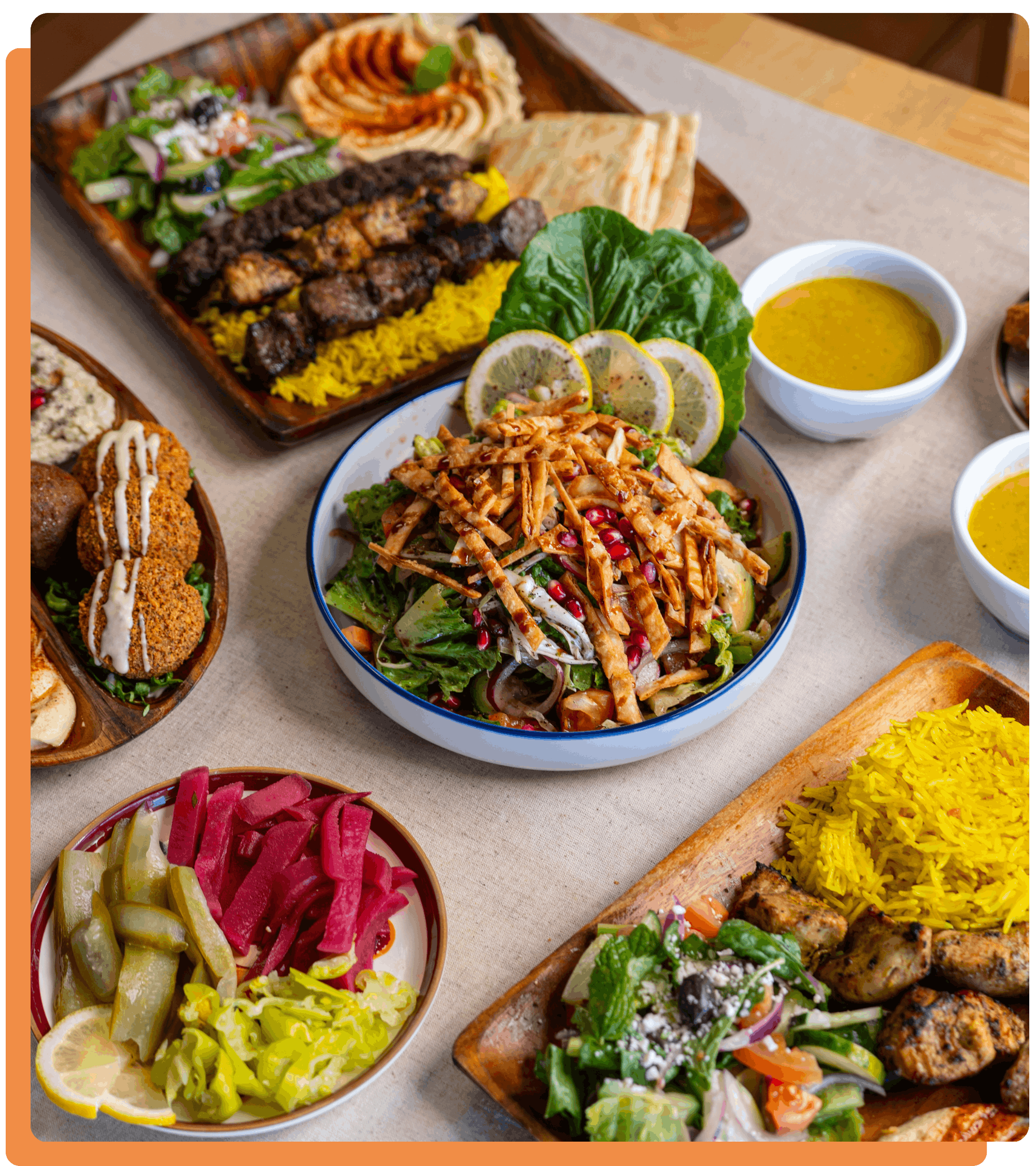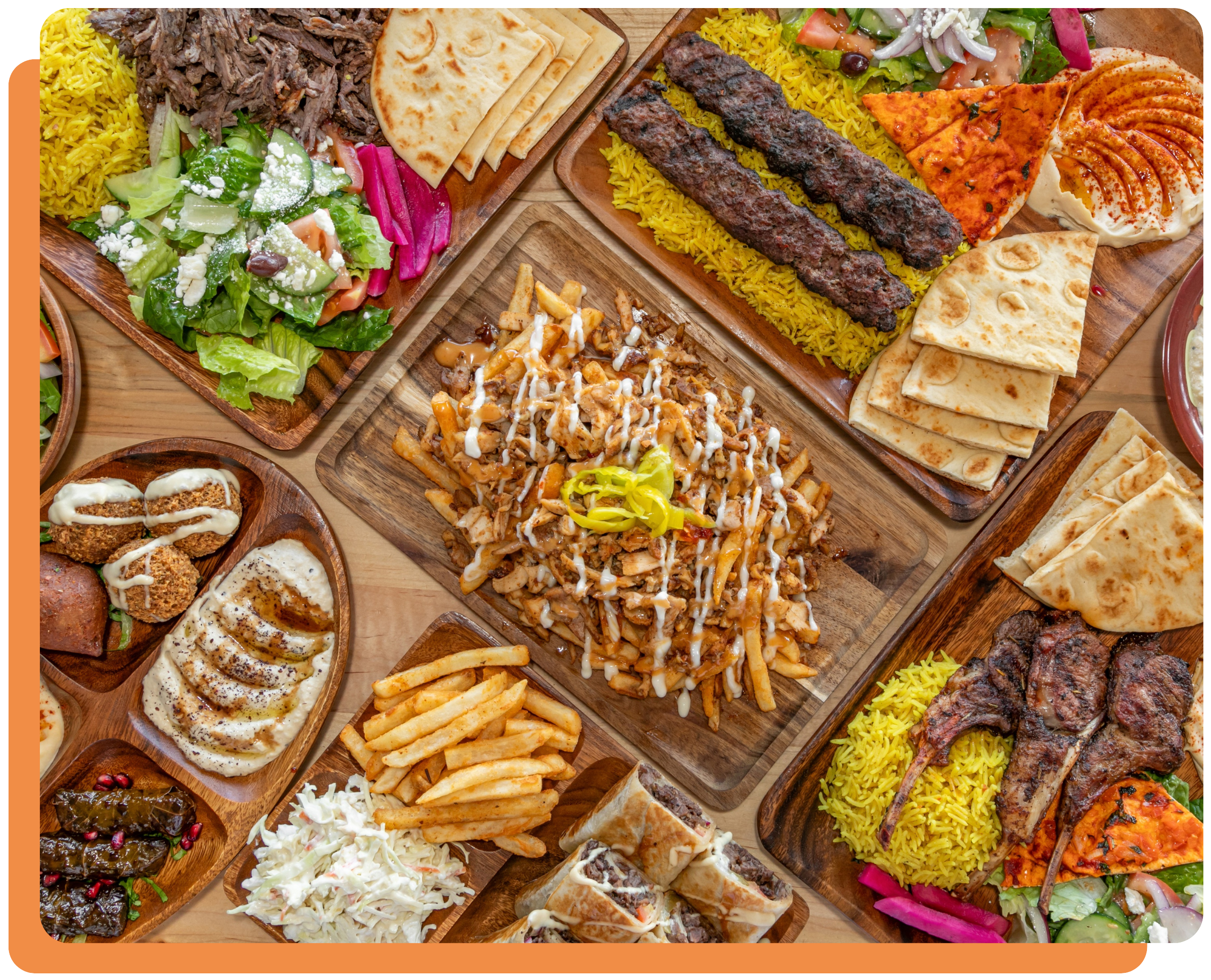 Shawarma, kebabs, fresh sides, and the sauces that bring it all together. We keep it simple: fresh ingredients, generous portions, and fast service for dine-in or takeout.